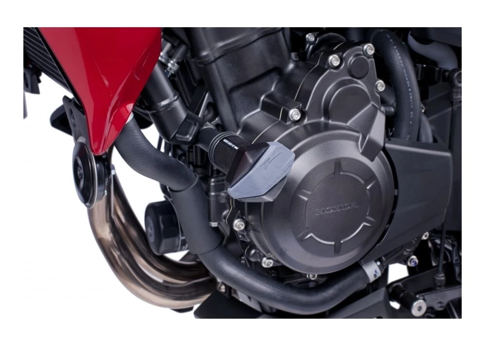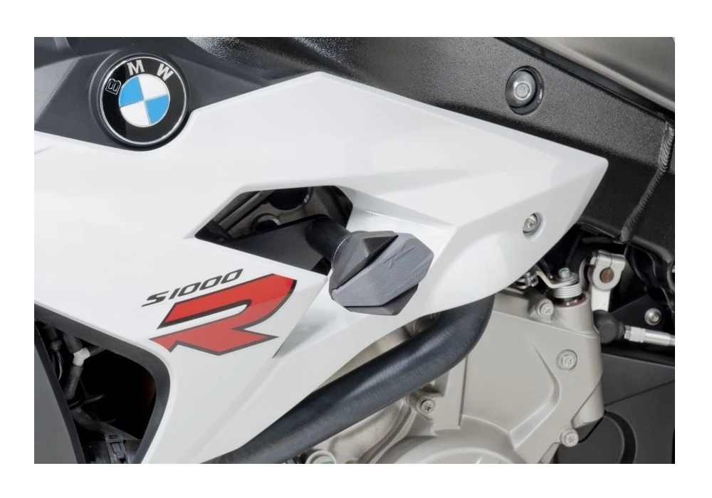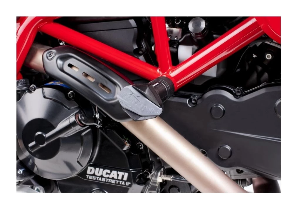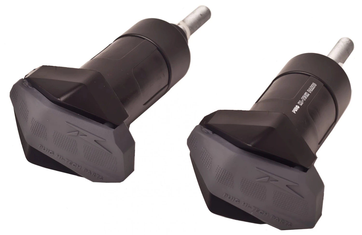 The Puig R12 Frame Sliders were designed to protect your motorcycles bars, frame and footpegs. This is achieved by making the slider shorter than the handlebars but longer than the footpegs. This mid-length design also reduces the chance of the Puig R12 catching on obstructions and flipping the motorcycle. The rubber bumper cap absorbs side impacts as well as softens impact with your shins and knees in the event contact during a crash or fall.